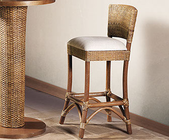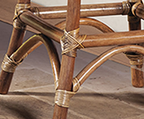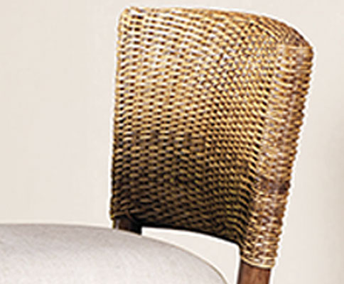 Trama fechada com o junco natural no assento e no encosto fazem harmonia com os pés de Rottin e as almofadas.