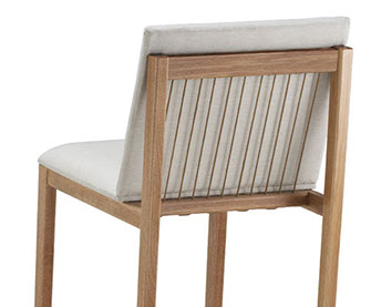 A Banqueta Nina é tramada com cordas nas costas, na vertical, e as almofadas com detalhe em Y nas costuras. Almofadas confortáveis e estilo elegante.
