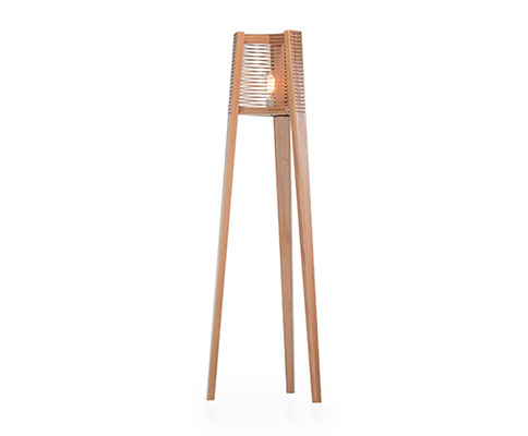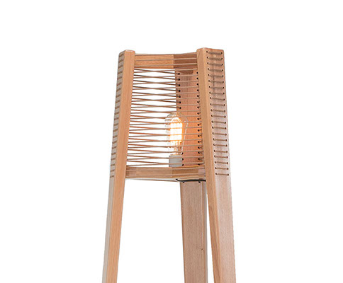 Estrutura em madeira de eucalipto renovável, levemente aberta na base, com trama artesanal em corda na cúpula em linhas retas. Indicado uso de lâmpada de filamento ST64.