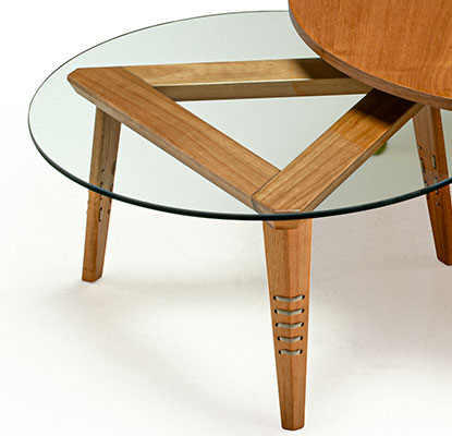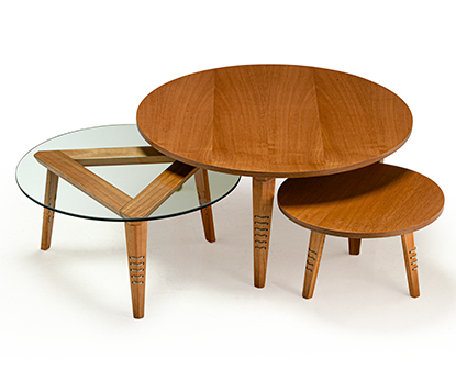 Inspiradas nas obras do arquiteto Oscar Niemeyer, essas mesas trazem consigo a madeira em cordas e a trama das cordas na forma triangular. Podendo ser tampo madeira ou vidro.